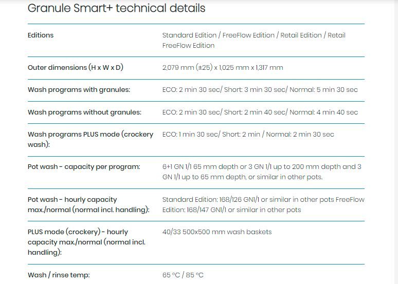 Granule Smart+ is suitable for kitchens preparing between 400 and 1,500 meals per day, depending on preparation and distribution processes.