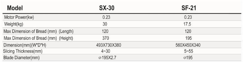 Features Stainless steel in all food contact areas. Operation is easy to be done by only one person. Small, easy and convenient for moving upon requirement. Efficient, fast speed and silent. Slicing thickness can be easily adjusted by handwheel. The machine has hone itself, and it can be used for sharpen the blade. With the safety cover. The blade can be kept clean by the crumb scraper. For safety, the motor is mounted with a brake, and the blade can stop immediately when the machine is turned off. SX—30, Rear-loading bread slicer.