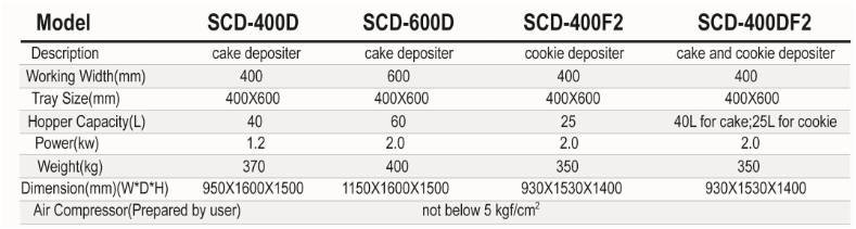 Features Stable performance with the LCD touch screen, PLC system and Servo motor. Good filling effection by Silica Gel gear roller. Two kinds of filling modes. Groups of parameter records convenient for usual operation. Clear to see all the parameter and situation of machine in Chinese and English on the display. Stainless steel body, easy for cleaning and sanitary for food grade requirement. Easy to scrape and collect the remains on the belt automatically. SCD-400D/SCD-600D, Cake depositer.