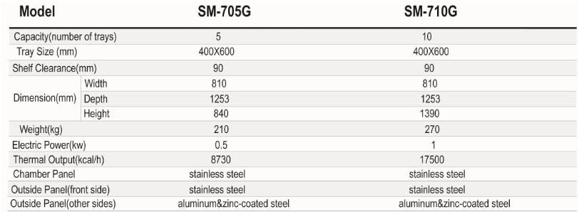 Features  Easy to use digital controls for temperature, steam and timer. Steam system included. Light and timer standard on each deck. Under oven proofer available. Door is designed to remain cool to the touch. SM-710G, Castors.